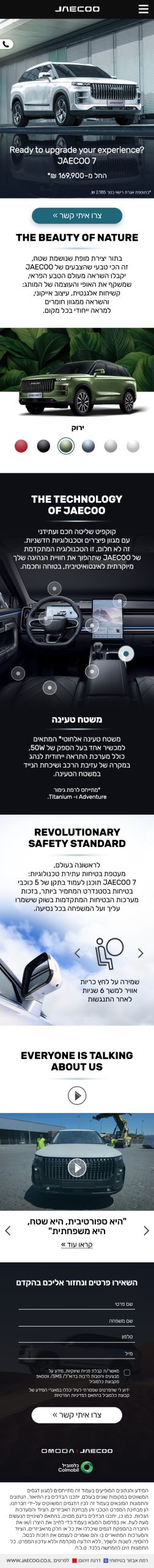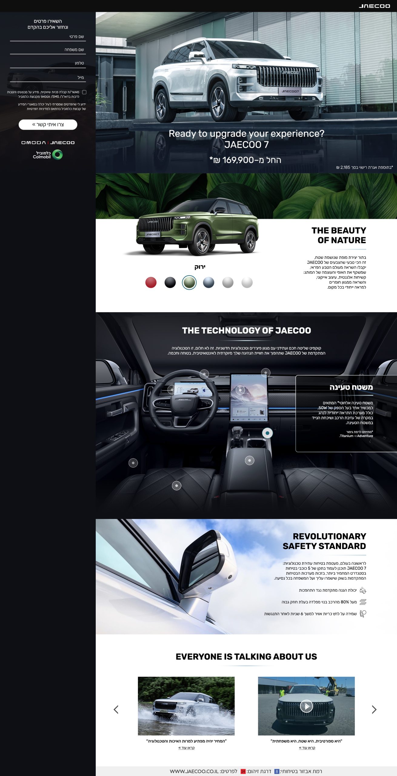 A promotional page for the launching of the JAECOO car brand in Israel. This informative page was designed to pique interest, attract the target audience of adventure and comfort loving people, and set the tone for JAECOO’s digital language.